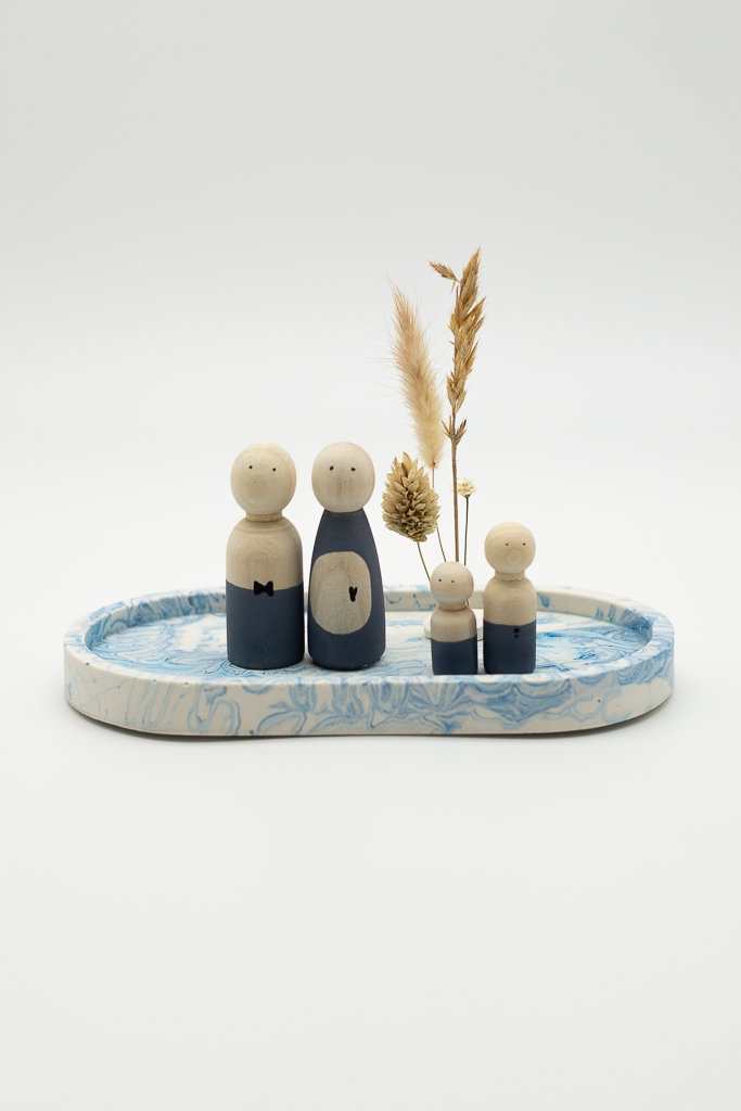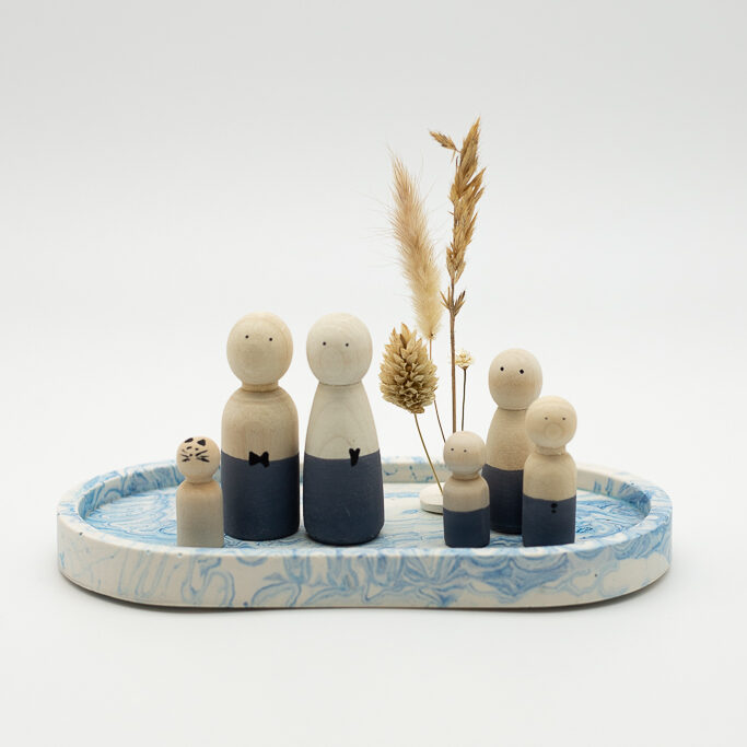 Leuke pegdoll familie van Tuurelur bestaande uit verschillende gezinsleden. Kies de juiste passende gezin-samenstelling.  De familie staat op een mooi ovaal terrazzo plateau van Favou en om het geheel gezellig aan te kleden staan er op de achtergrond een paar droogbloemen. Dit staat helemaal leuk in de woonkamer op het dressoir of in een kast waarin je persoonlijke dingen verzameld.