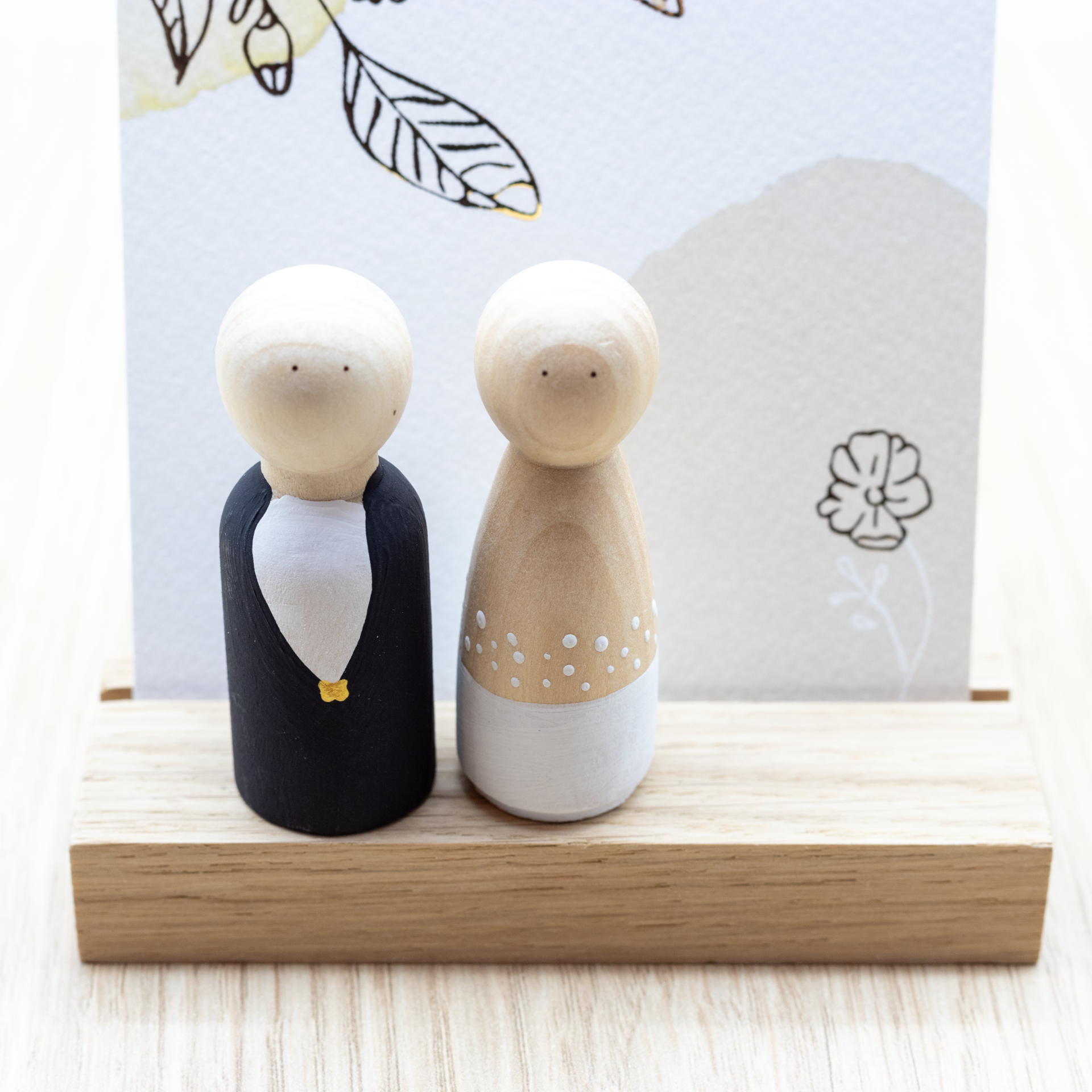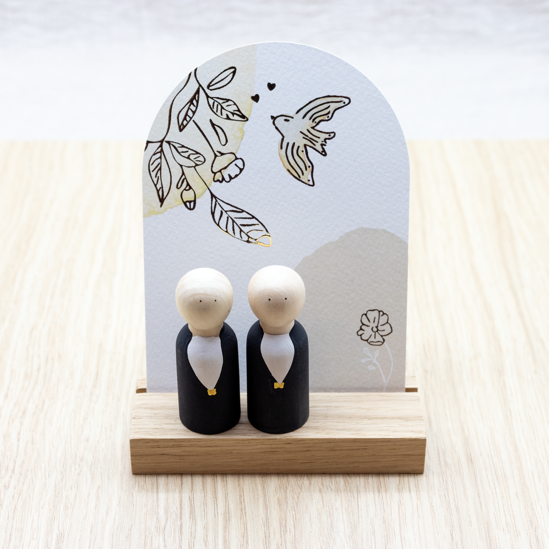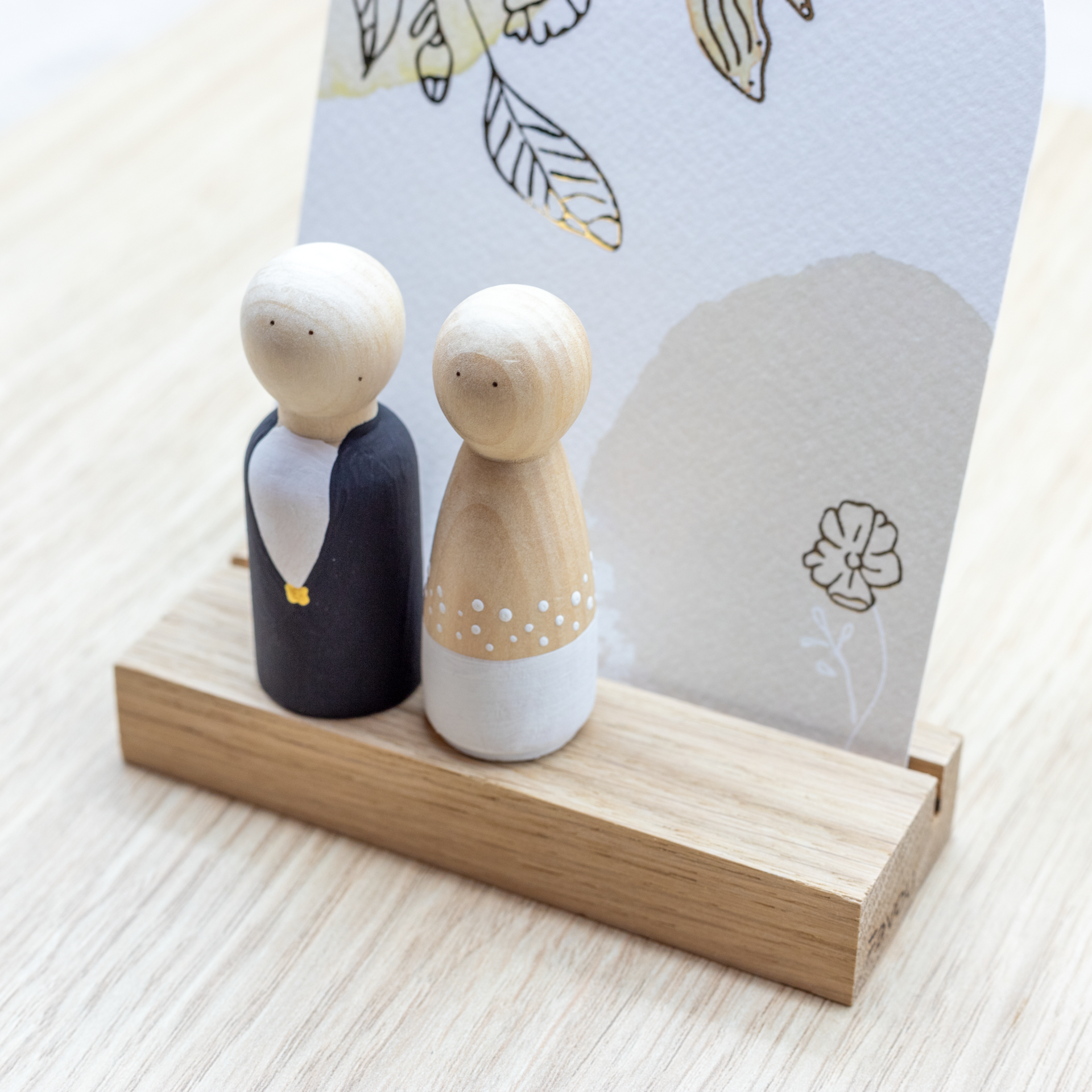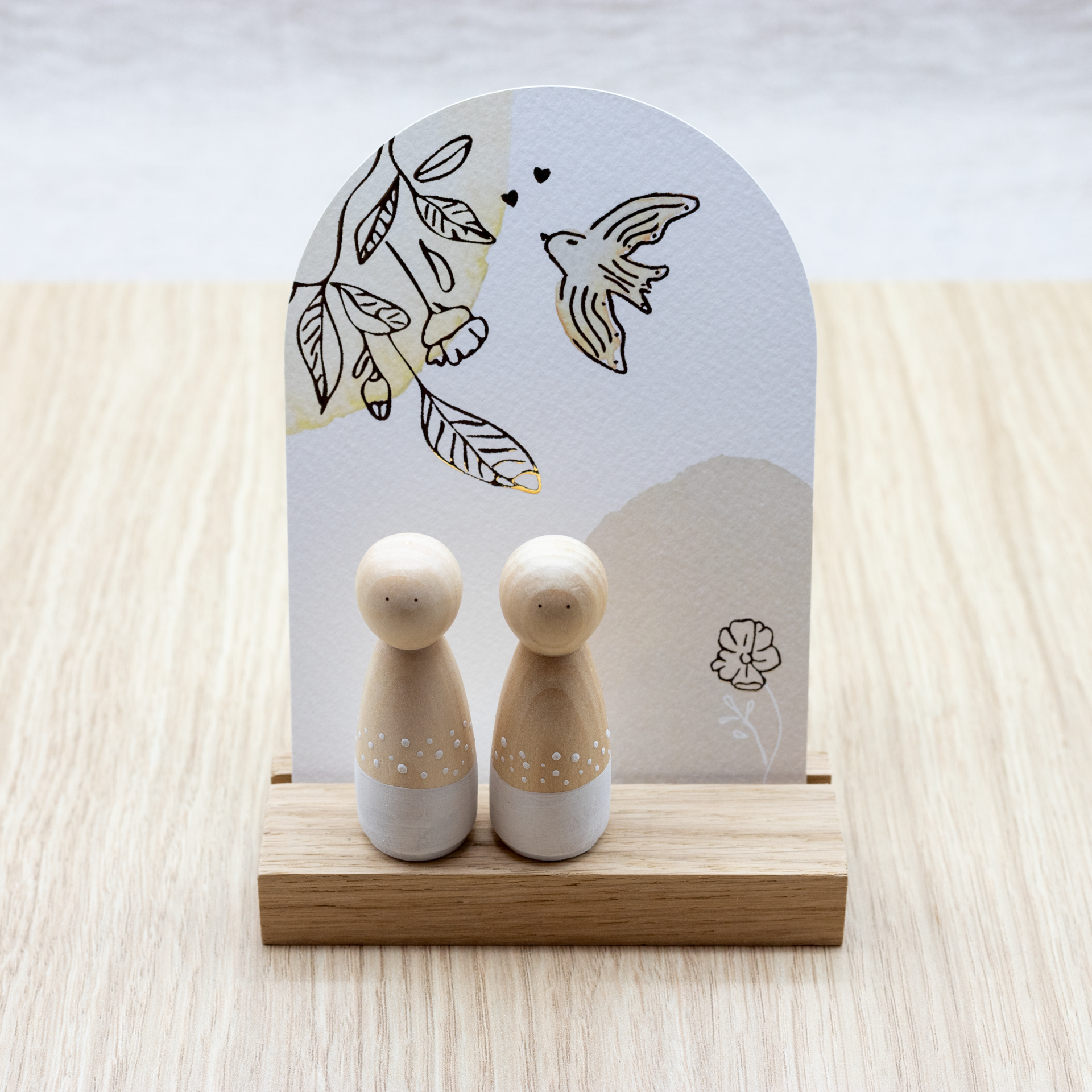 Dit houten plateau met goudfolie kaart en pegdoll bruidspaar is een uniek cadeau voor een huwelijksfeest. De liefdes duif schittert in goudfolie op deze kaart in A6 formaat.